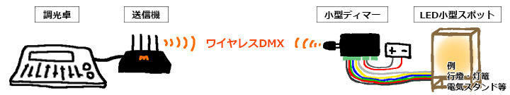 使い方は簡単です。調光卓からの信号をDMX送信機で送り、小型ディマーで受信するだけ。