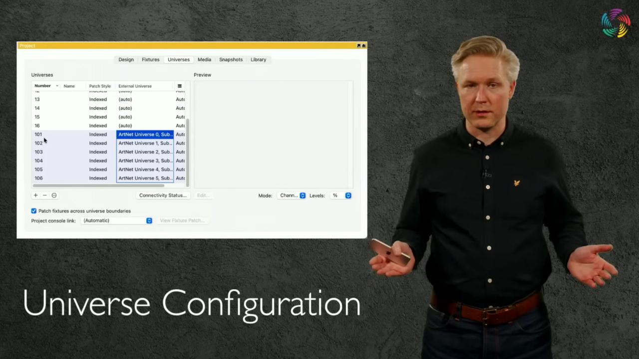 従来のように少数の物理DMXラインを前提にするのではなく、多数のユニバースをまとめて扱う運用を意識し、ユニバース範囲の選択、番号の振り直し、DMXソースの再マッピングといった操作を、より扱いやすくした点が特徴です。