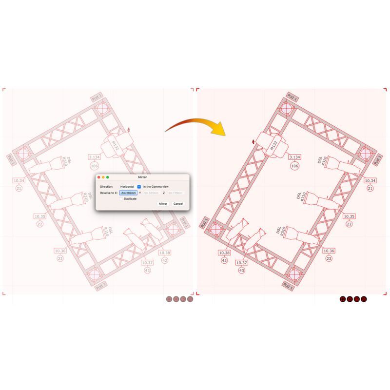 ・Capture では、2Dのスケッチに近い図面から、3Dで製図した図面まで、しっかりとカバーすることができます。必要な全ての灯体を書き込み、様々な吊り込み方法を試し、異なるゴボやカラーも試してみることが可能なのです。また、突発的なステージ機構の変更や、美術セットの変更などにも、簡単に適応させることができます。