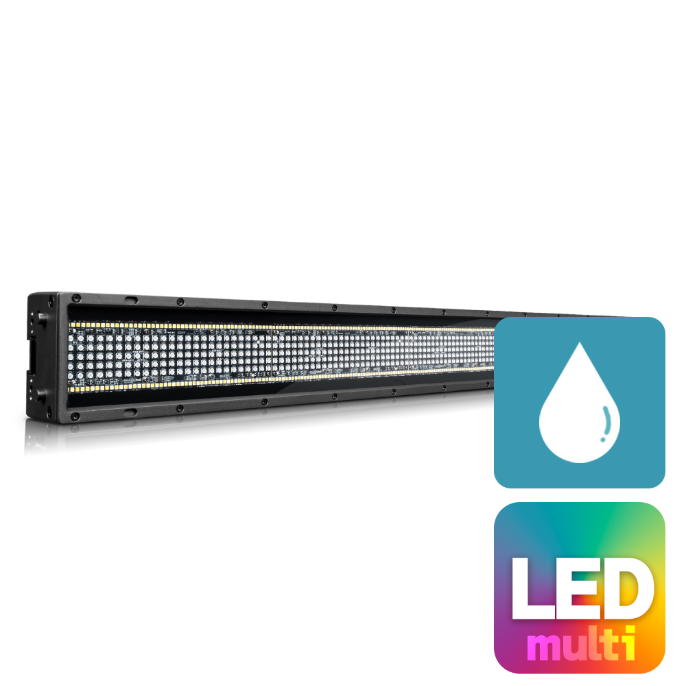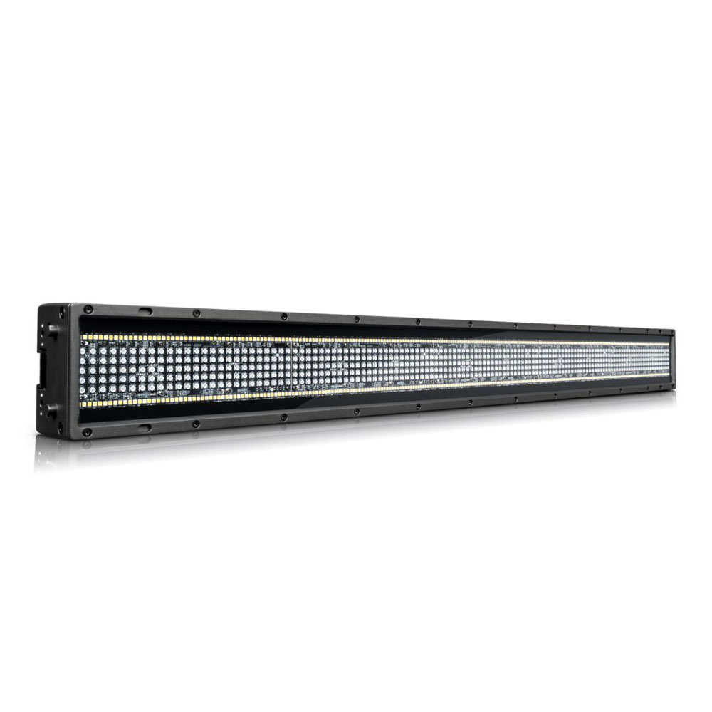 TAMBORA STORMY LINEARは、RGBメインエンジンとストロボエンジンを組み合わせた高出力リニア照明機材で、5x5 SMD RGB LEDを25ユニット(合計625LED)と、各ラインに125CW+125WWの1W LEDを2ライン搭載しています。高効率光学系により26,776ルーメンの出力を実現し、2500K〜8000Kの色温度制御に対応します。高度なレイヤーマネジメントによりカラー、内部シェイプ、ピクセルマッピング、ストロボを組み合わせた多彩な演出が可能です。