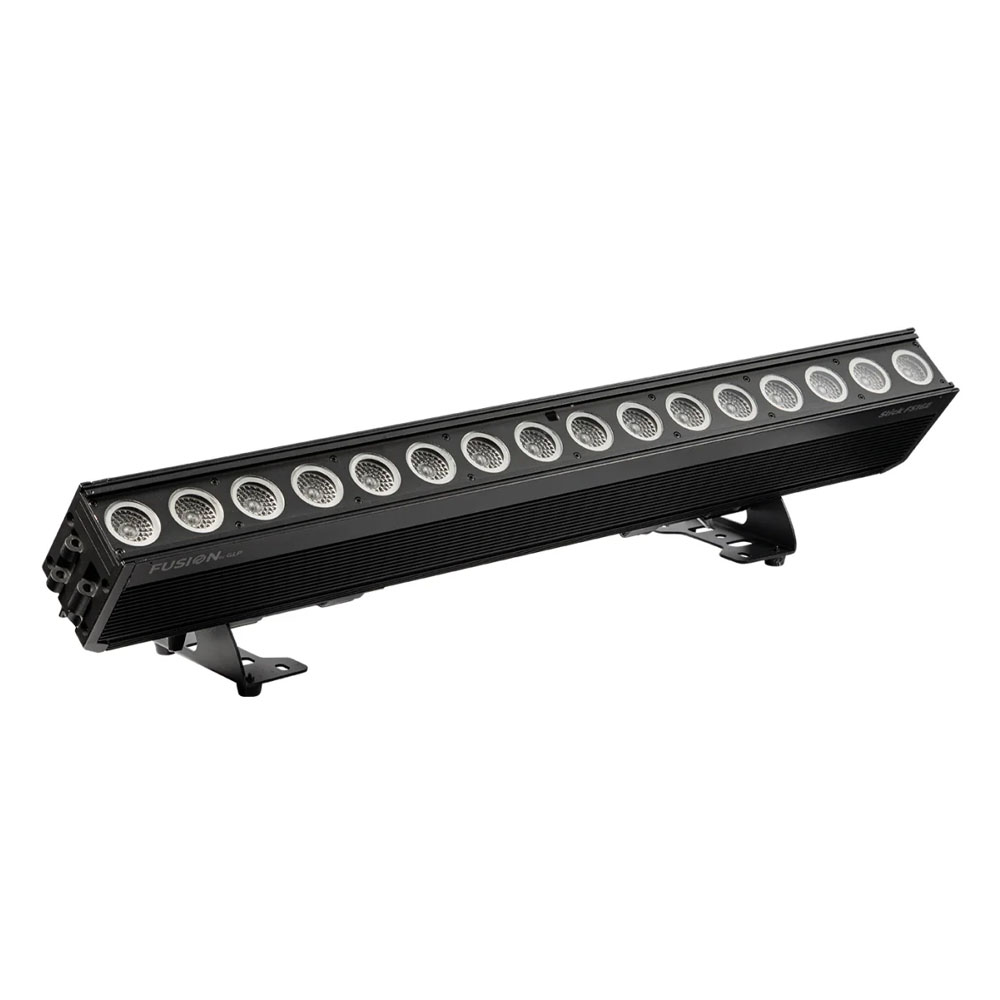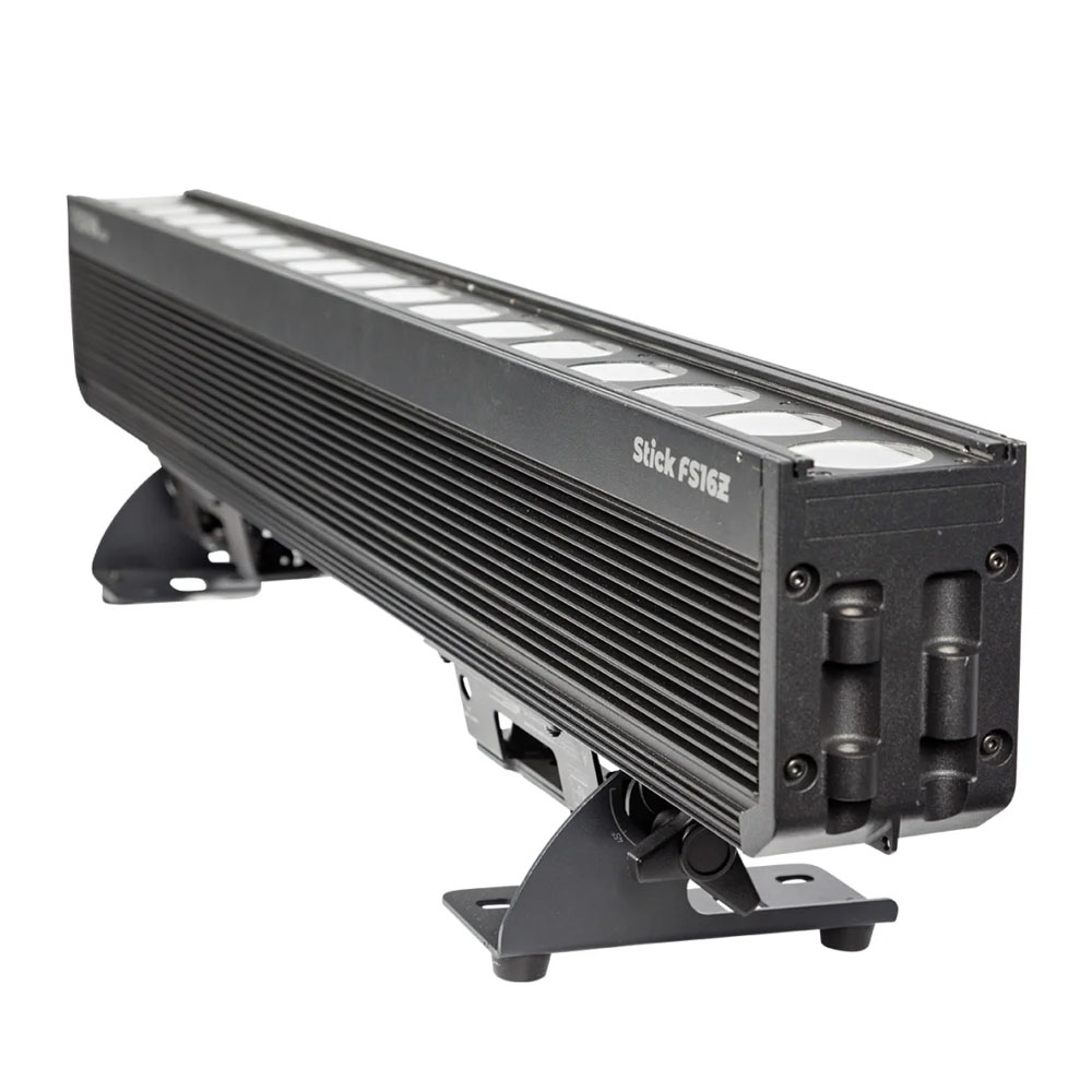 FUSION Stick FS16 Zは、屋外使用に対応したIP65仕様のリニアLEDバテンライトです。16個のRGBW LEDを光源とし、モーター制御ズームにより8°から40°までのビーム角を調整できます。Halo Ring構造によりフロントレンズ周囲のリングが各ピクセルの視認性を高め、テレビ撮影などさまざまなカメラアングルでもピクセルが明確に見える演出が可能です。ファンレス設計により静音動作を実現し、劇場やテレビスタジオなど静粛性が求められる環境でも使用できます。複数機材を連結した演出にも対応し、縦吊りやスタンド設置など柔軟な設置方法が可能な照明機材です。