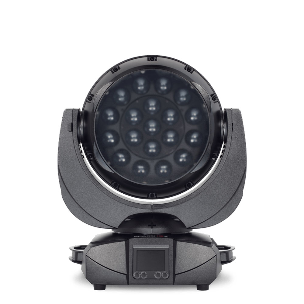 Sparx 12Aは、JB-Lightingが開発したウォッシュ/ビーム兼用のLEDムービングライトです。19個の40 W RGBW LEDを光源とし、最大10,500ルーメンの光出力を実現します。TwinZoom光学システムにより7°〜65°の広いズーム範囲を持ち、ハードエッジのビームからソフトなウォッシュまで柔軟に調整できます。光学設計はFresnelタイプの均一な配光を実現し、優れたカラーミキシングと低い散乱光を特徴としています。静音設計の冷却システムにより約29 dB(A)の低騒音動作を実現し、劇場やスタジオなど静粛性が求められる環境でも使用できます。