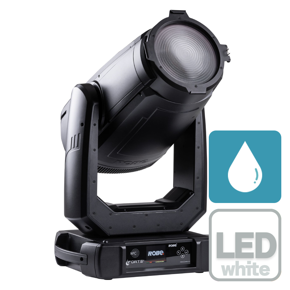 iFORTE Fresnelは、Robe iSeriesの中で最も高出力クラスのFresnelウォッシュライトです。IP65保護構造を備え、過酷な屋外環境でも使用できる設計となっています。iSE-TE 1000W White LEDエンジンを光源とし、最大40,500ルーメンの光出力を実現します。F2L Fresnelレンズシステムと10:1モーターズームにより、6°〜61°の広いズーム範囲で柔らかく均一なウォッシュビームを生成します。RotaScrimモジュールやMagFrostフィルター、PLANO4フレーミングシステムなど高度なビームコントロール機能を搭載し、コンサートツアーから劇場、屋外イベントまで幅広い用途に対応します。