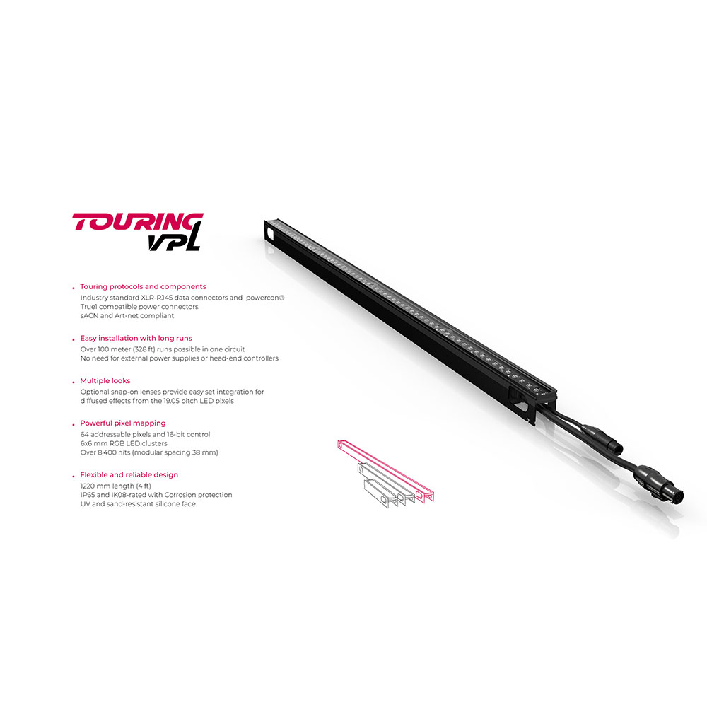 Touring VPL 1220-20は、ピクセルマッピングやメディアエフェクトを再現するために設計されたDirect Viewビデオピクセルリニア照明です。高い輝度と広い視野角を備え、ダイナミックな映像演出を実現します。ツアー用途の標準電源およびデータコネクターを採用し、外部電源を必要とせず簡単に統合可能です。低プロファイルブラケットや各種アクセサリーに対応しており、コンサート、スタジアム、舞台セット、サウンドステージなどの一時設営環境での使用に適しています。