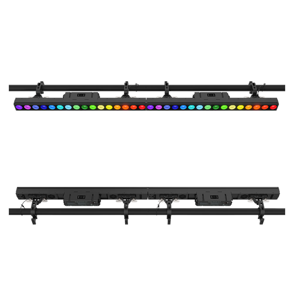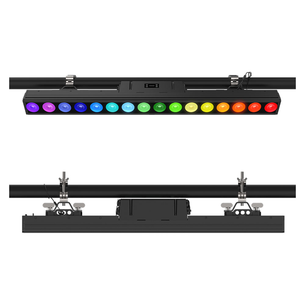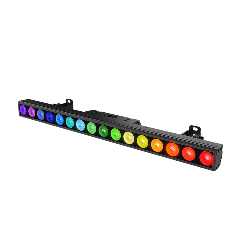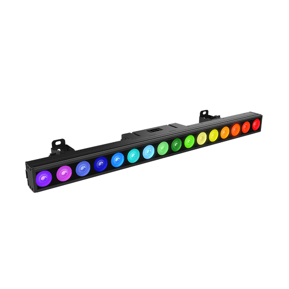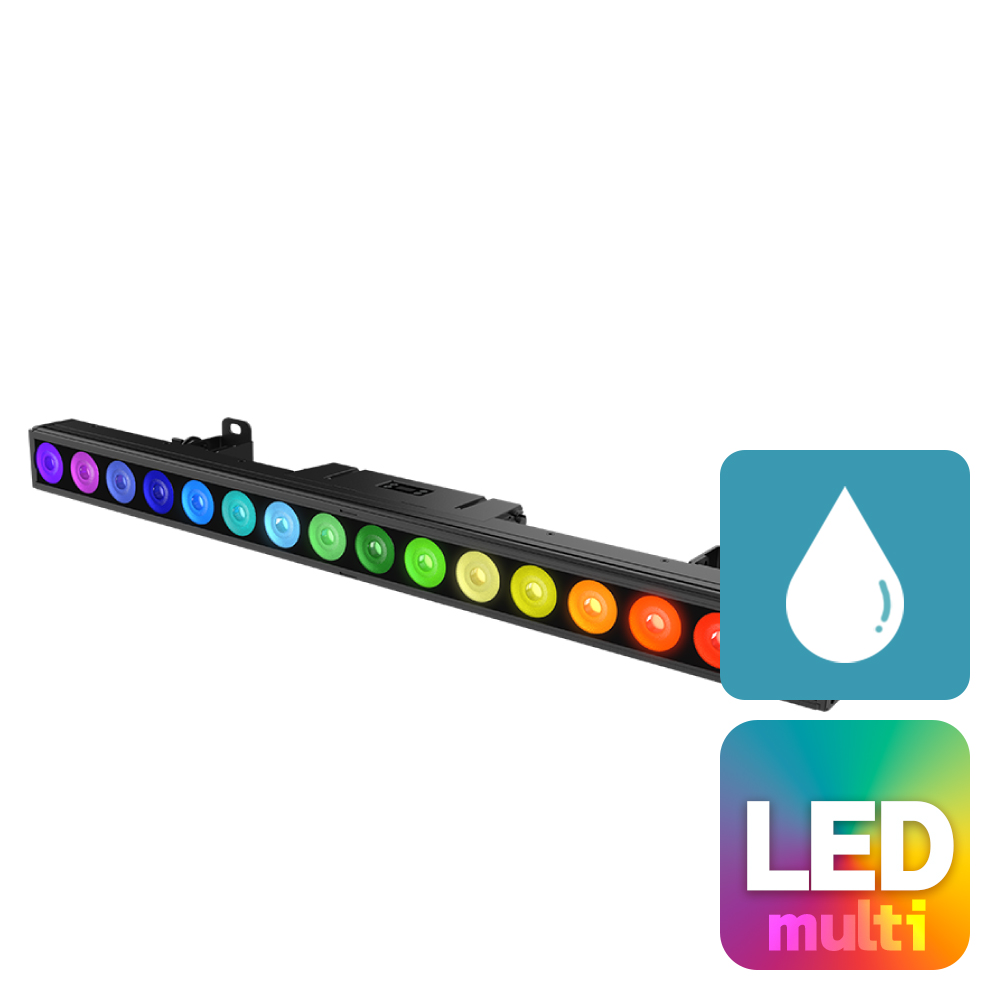 HUELINE 16 IP は ACME LIGHTING が設計した多機能リニアバーライトで、16 × 25W RGBWAC+UV LED を搭載し、多様な色表現と UV 効果を実現します。各 LED は個別に制御可能で、電子フロスト効果により柔らかなウォッシュや視覚的なエフェクトを演出できます。超狭ベゼル設計によって大きな照射面積を確保し、付属スタンド使用時には 90° のチルト調整が可能です。IP66 等級により屋内外を問わず使用できます。