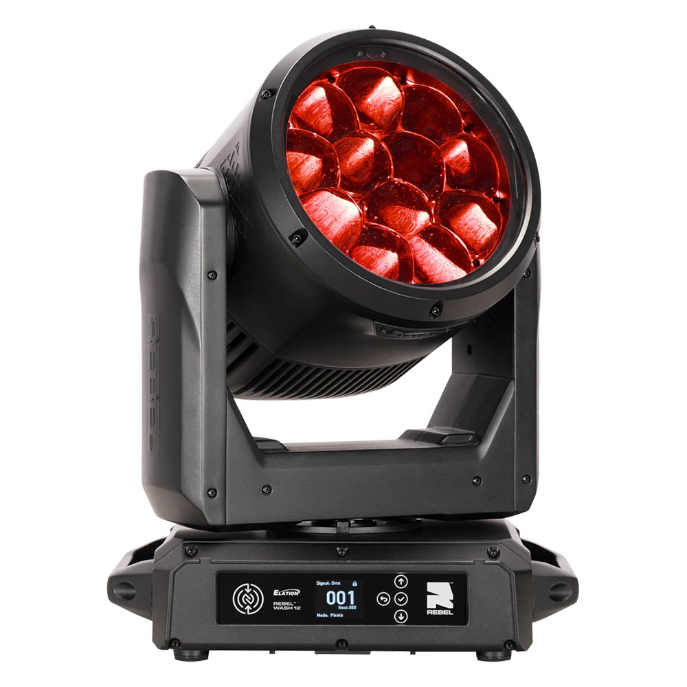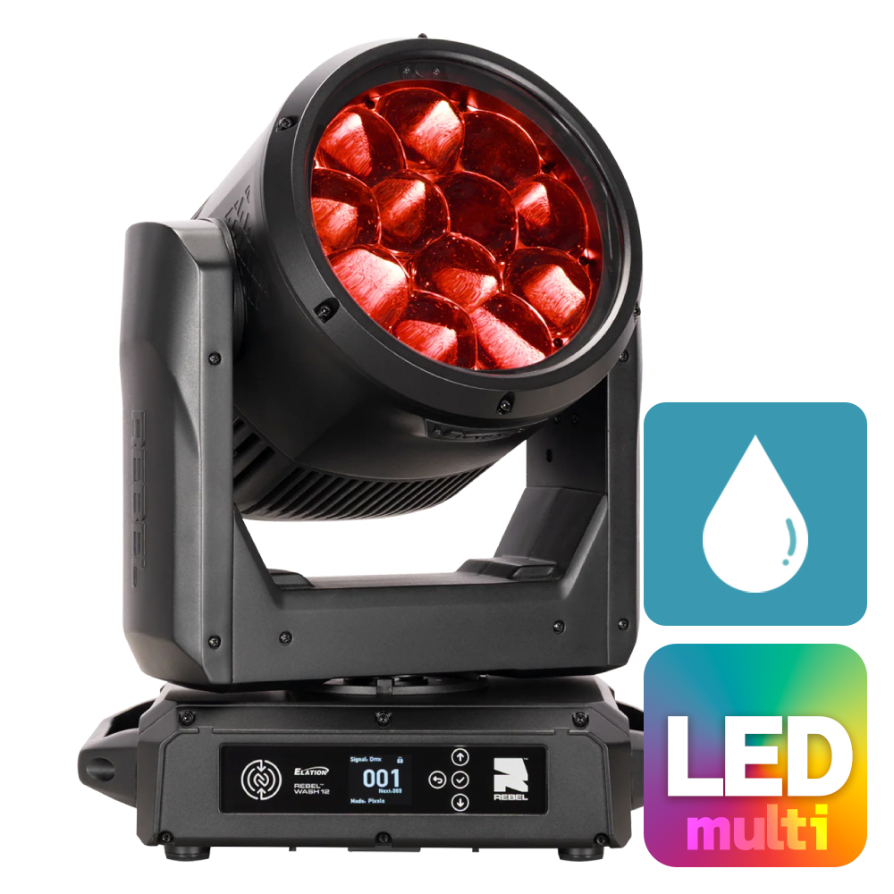 REBEL WASH 12は、RGBL LEDを12基搭載した高出力LEDウォッシュムービングライトです。最大14,000ルーメンの出力と5°〜40°の高速ズームにより、シャープなビームから均一なワイドウォッシュまで幅広い表現に対応します。IP65等級の堅牢な筐体設計により、屋内および一時的な屋外環境での使用が可能で、ライブイベント、ツアー、放送、常設設備など多様な現場に適しています。