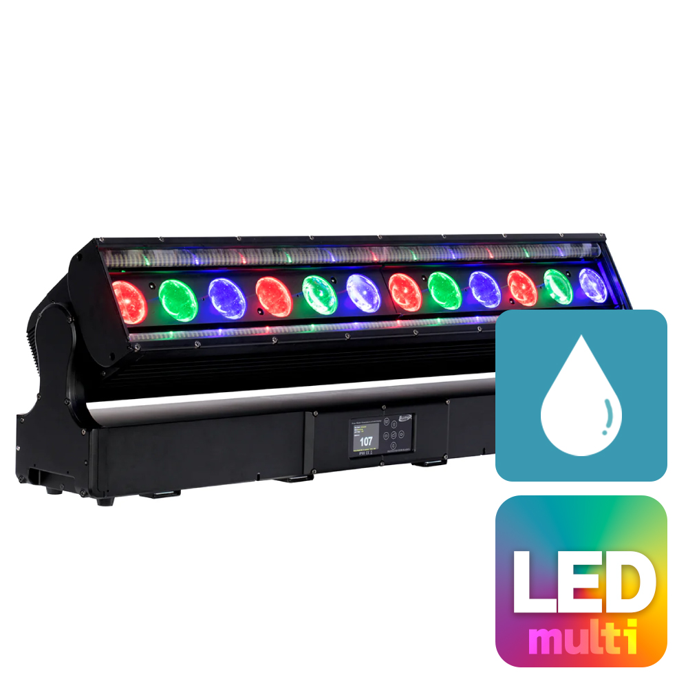 PROTEUS RAYZOR BLADE Lは、リニアウォッシュ、ストロボライン、SparkLEDエフェクトを1台に統合したIP65対応の高出力LEDリニアFXライトです。RGBW LEDによる高輝度ウォッシュ出力に加え、前面レンズ内で発光するSparkLEDと高出力ホワイトストロボラインを組み合わせることで、立体感のあるビジュアル表現と強烈なフラッシュ演出を実現します。6°〜45°のズーム範囲により、ミッドエアビームから均一なウォッシュまで幅広く対応し、屋内外のイベントやツアー、常設設備で高い演出効果を発揮します。