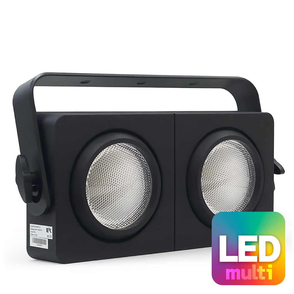 EK PRO「BLINDER2C」はRGBA + WW LEDを搭載した2灯タイプのフルカラーオーディエンスブラインダーです。クラシカルなルックスとレンズの組み合わせにより、ハロゲン式のブラインダーと同等の効果が得られます。PWM周波数の切り替えプリセットも内蔵されており、様々なシャッター速度のカメラに対応します。クラシックなレッドシフトエフェクト機能により、ディマーを下げた際に赤みがかった消え方も選べます。
