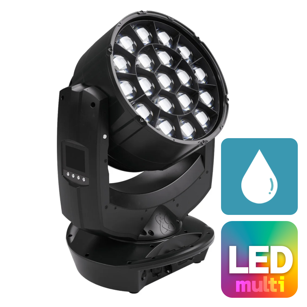 impression X5 IPは、屋外使用に対応するIP65等級のLEDウォッシュムービングライトです。RGBL LEDを19基搭載し、高い光出力と自然で精密な色再現を両立します。ズーム機構により狭角ビームから広角ウォッシュまで柔軟に対応し、ピクセル制御とダイナミックなエフェクトによって、ツアー、フェス、屋外イベント、常設設備など幅広い現場で高い演出力を発揮します。
