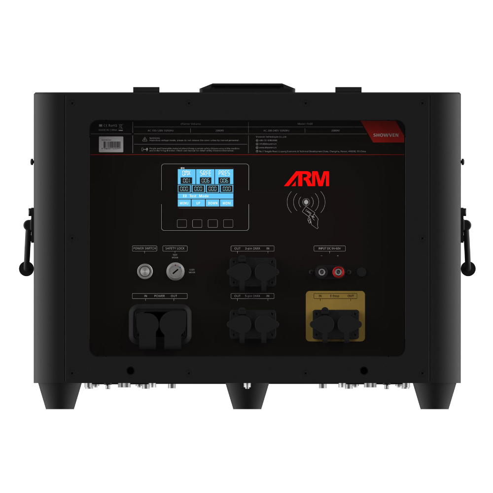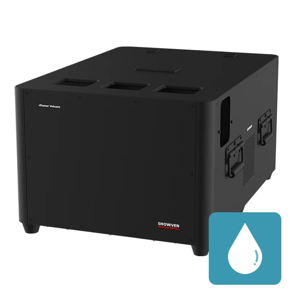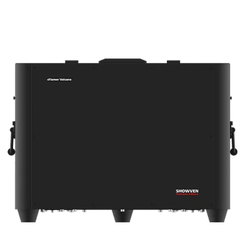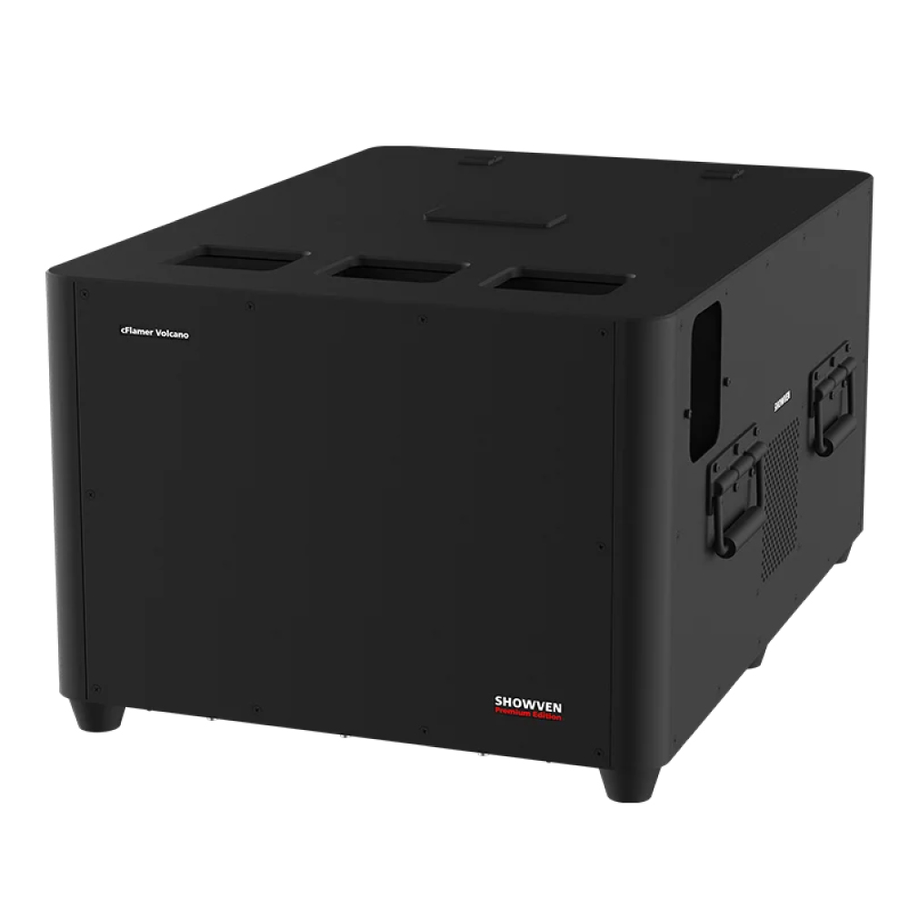 SHOWVENのcFlamer Volcanoは、5ノズル構成のカラーフレームマシンで、5方向への炎出力が可能な高出力モデルです。各ノズルは個別制御または同時発射が可能で、大規模なステージ演出やイベントに適したダイナミックなフレームエフェクトを実現します。カラー添加剤を使用することで複数色の炎を生成できます。